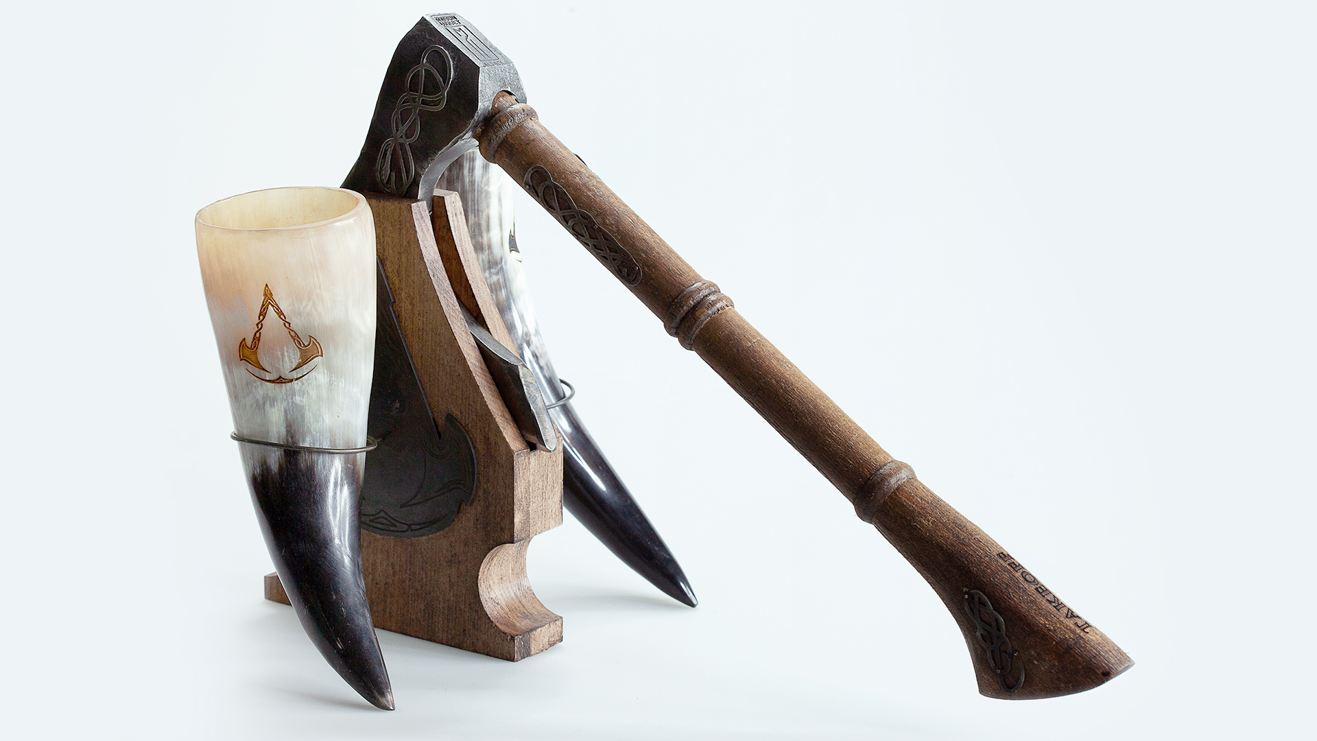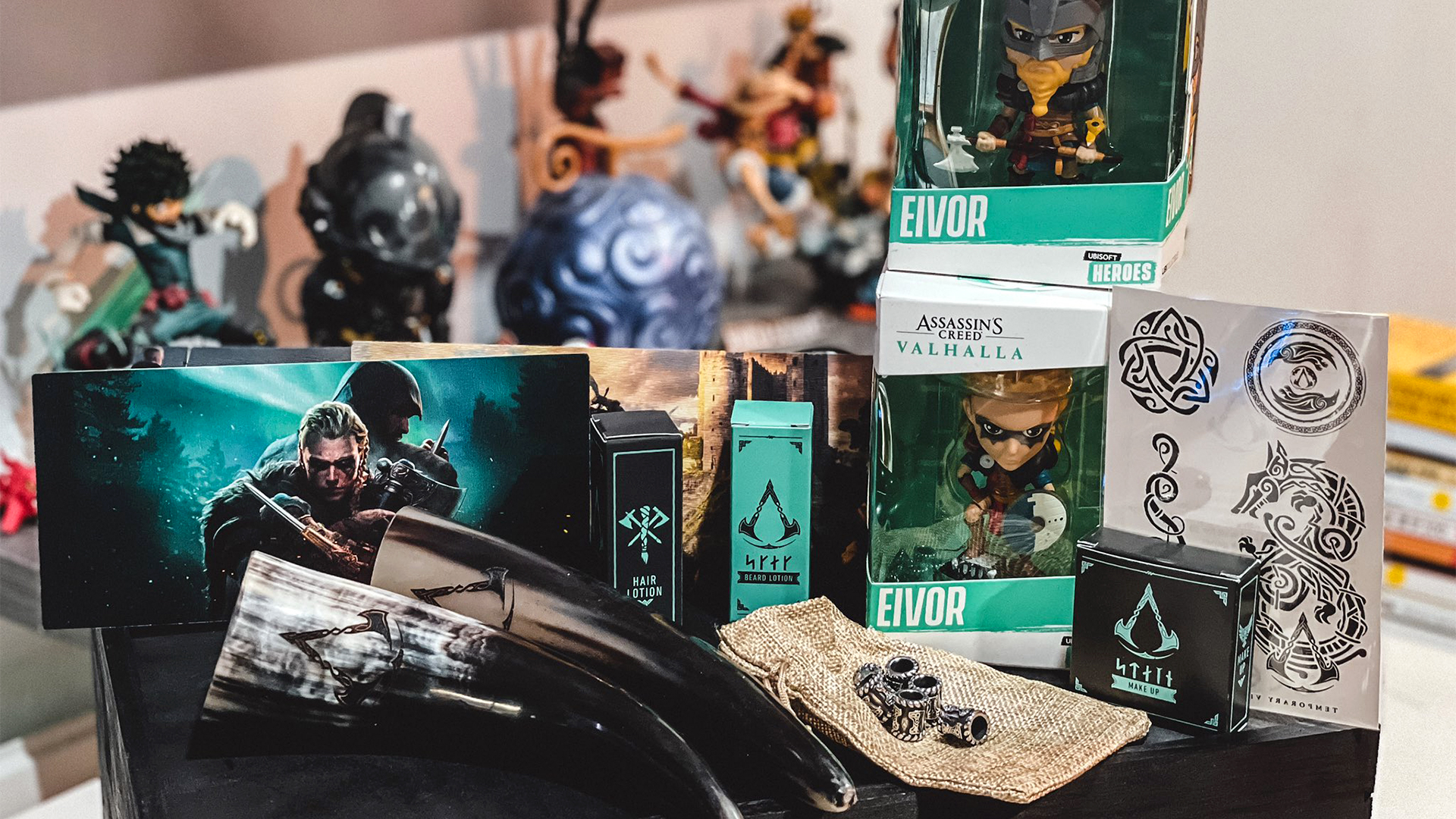 Bounty inside the crate included AC-branded tools including a fighting horn, beard oil and hair lotion, rune-style tattoos, Ubisoft Heroes figures of Eivor, vinyl soundtrack, axe display and exclusive artwork.