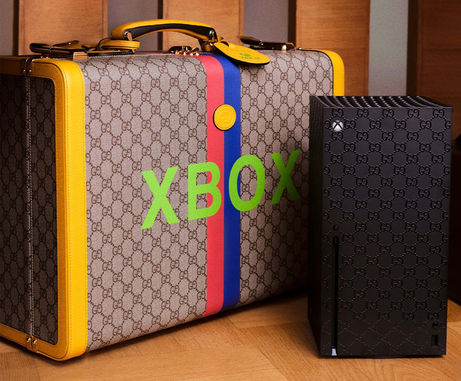 Complementing each console were two custom black wireless Xbox controllers, featuring blue and red stripes along the left face that were inspired by House Web. The set was housed in a vintage luggage carry case, including ‘XBOX’ and ‘GOOD GAME’ logos. The Gucci Xbox set was a social media sensation, and was even a feature on The Tonight Show Starring Jimmy Fallon.