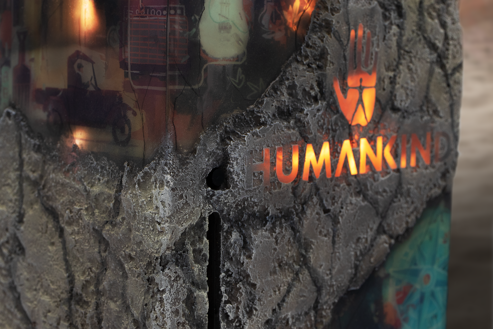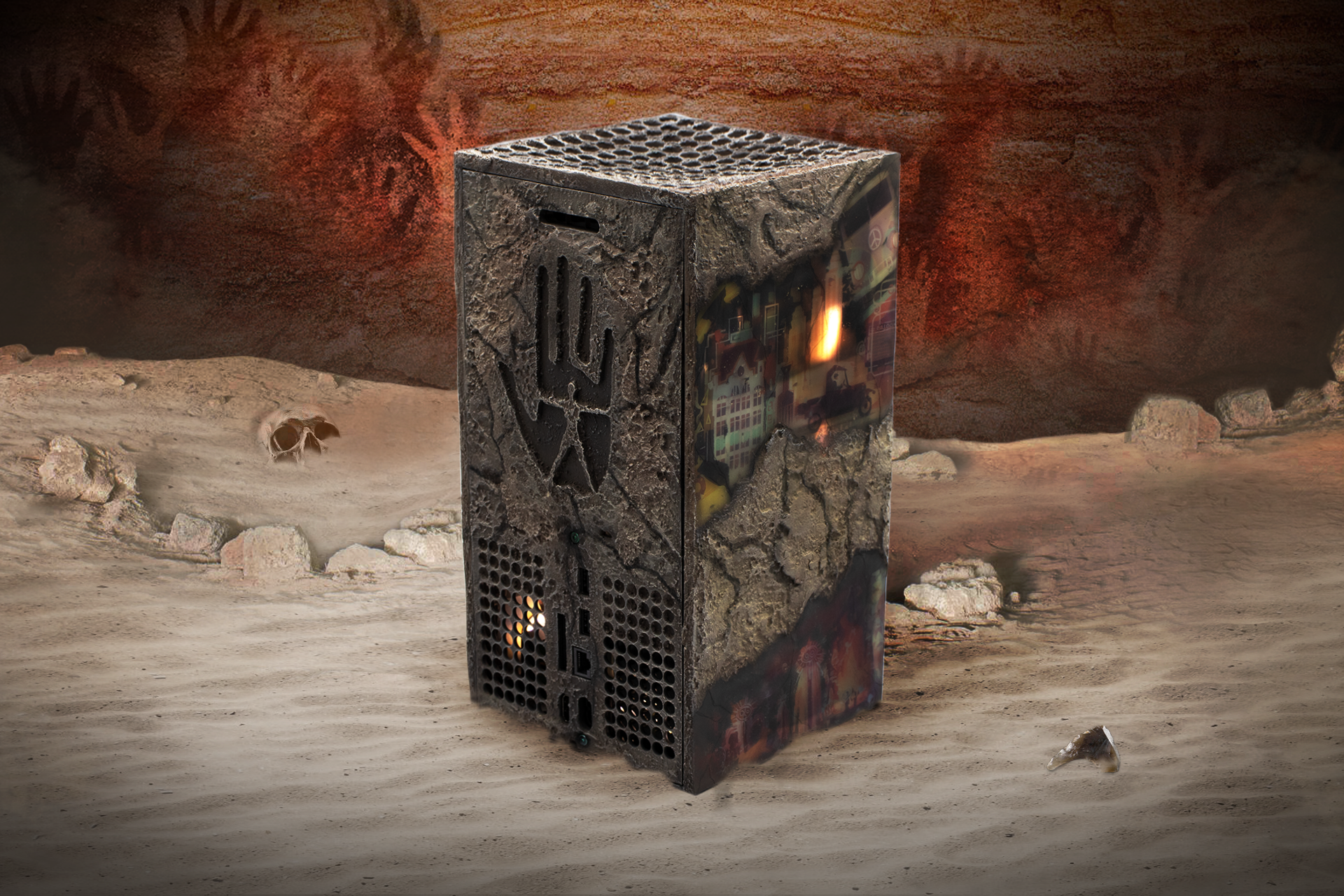 Where better to start than the beginning? Amplitude sent us the assets from the trailer, and our design team worked to create a custom Xbox Series X console that resembled the prehistoric walls of a cave, complemented by orange lighting to represent the flickering flames of a campfire. The console and controllers also featured Humankind branding, and were used as give aways.