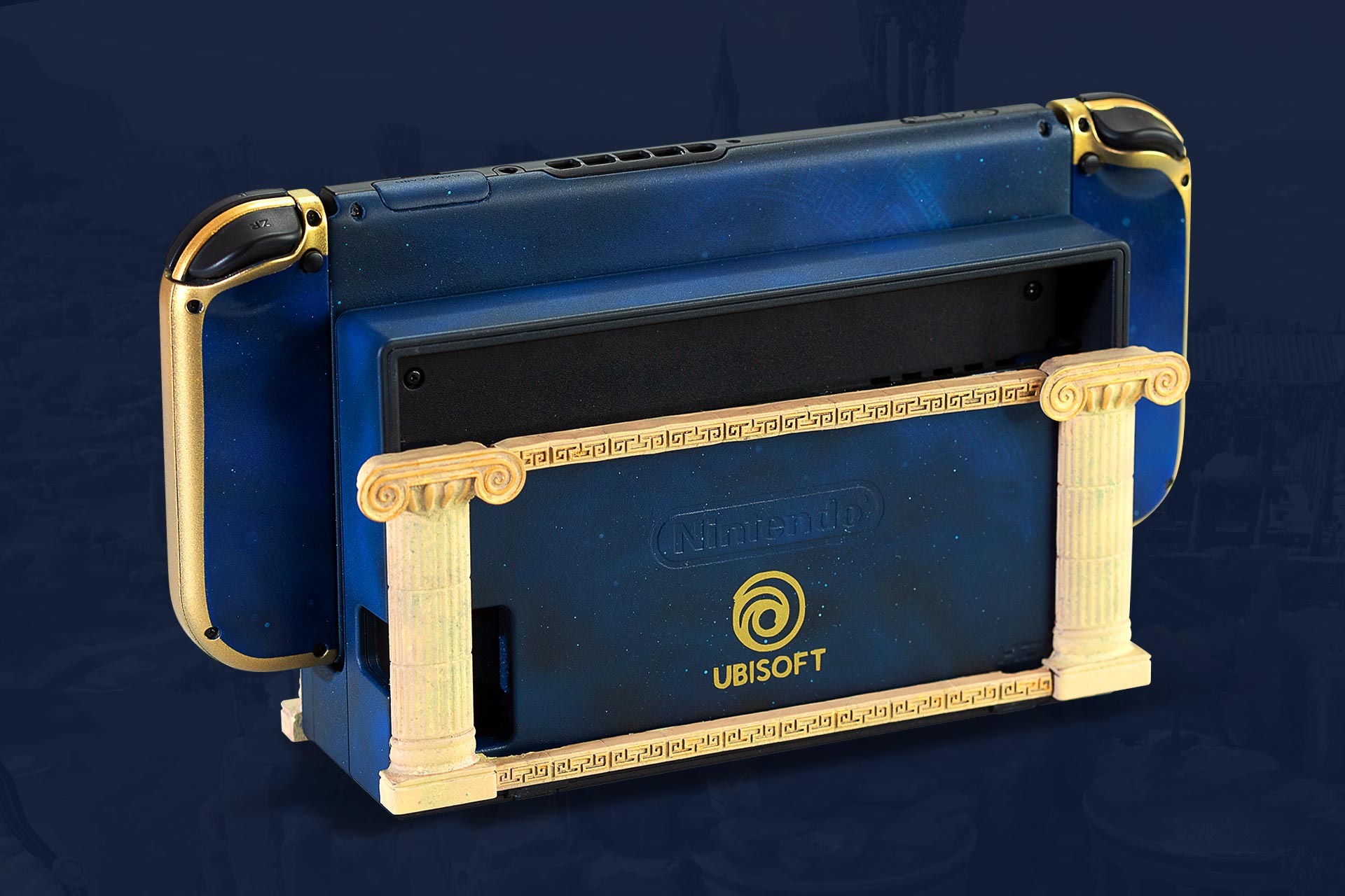The Ubisoft logo can also be found on the back of the mount. The starry design also features on the Switch itself and the Joy-Cons; the latter of which feature golden detail and outlines, as well as ‘wing’ logos on each controller. The Switch screen itself is also bordered with a golden Greek key pattern.