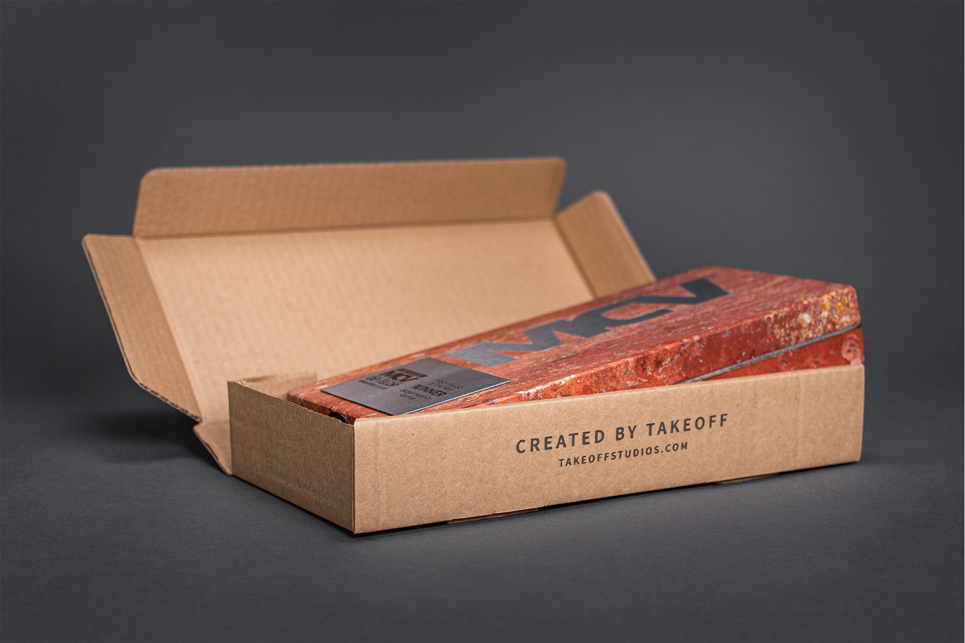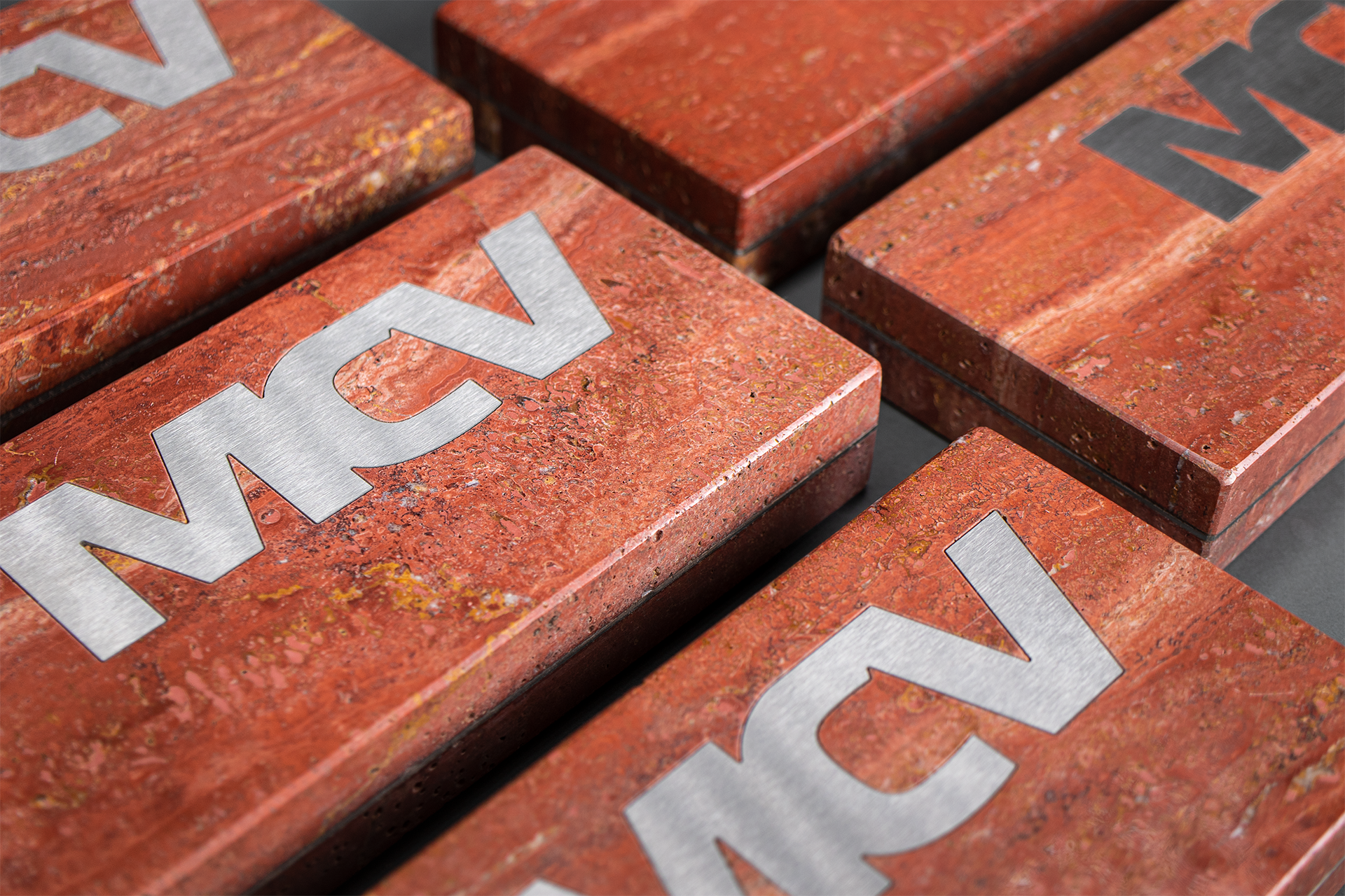 Our 23 trophies were created from a red marble from Spain called Rosso Alicante, which was specially cut to shape by water jet. They were very heavy to emphasise quality and finished by hand, with experienced artists branding them with brushed-aluminium MCV logos. We have also created branded packaging for the trophies to be handled in.