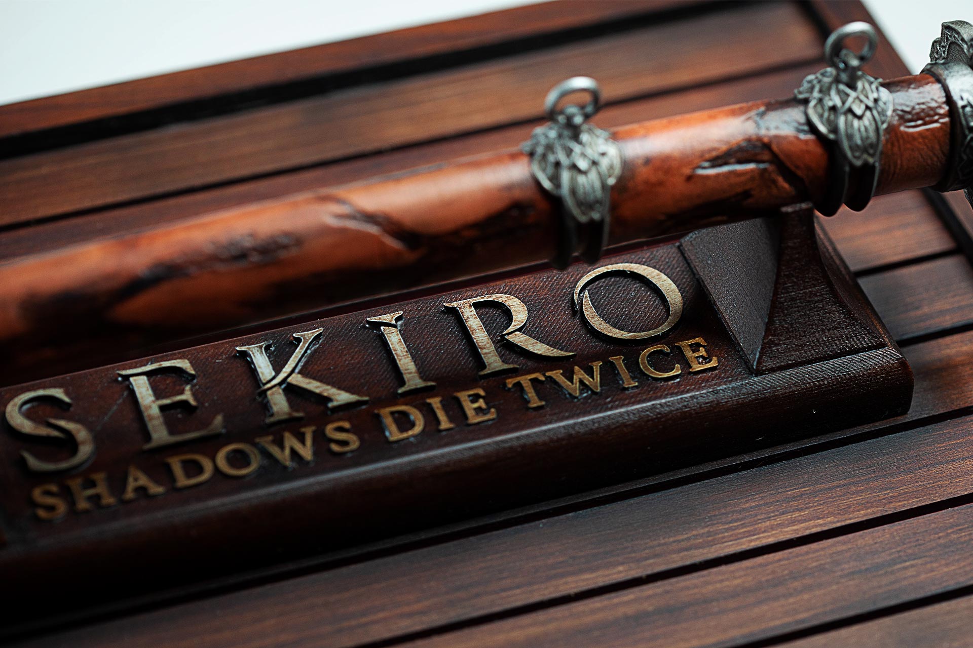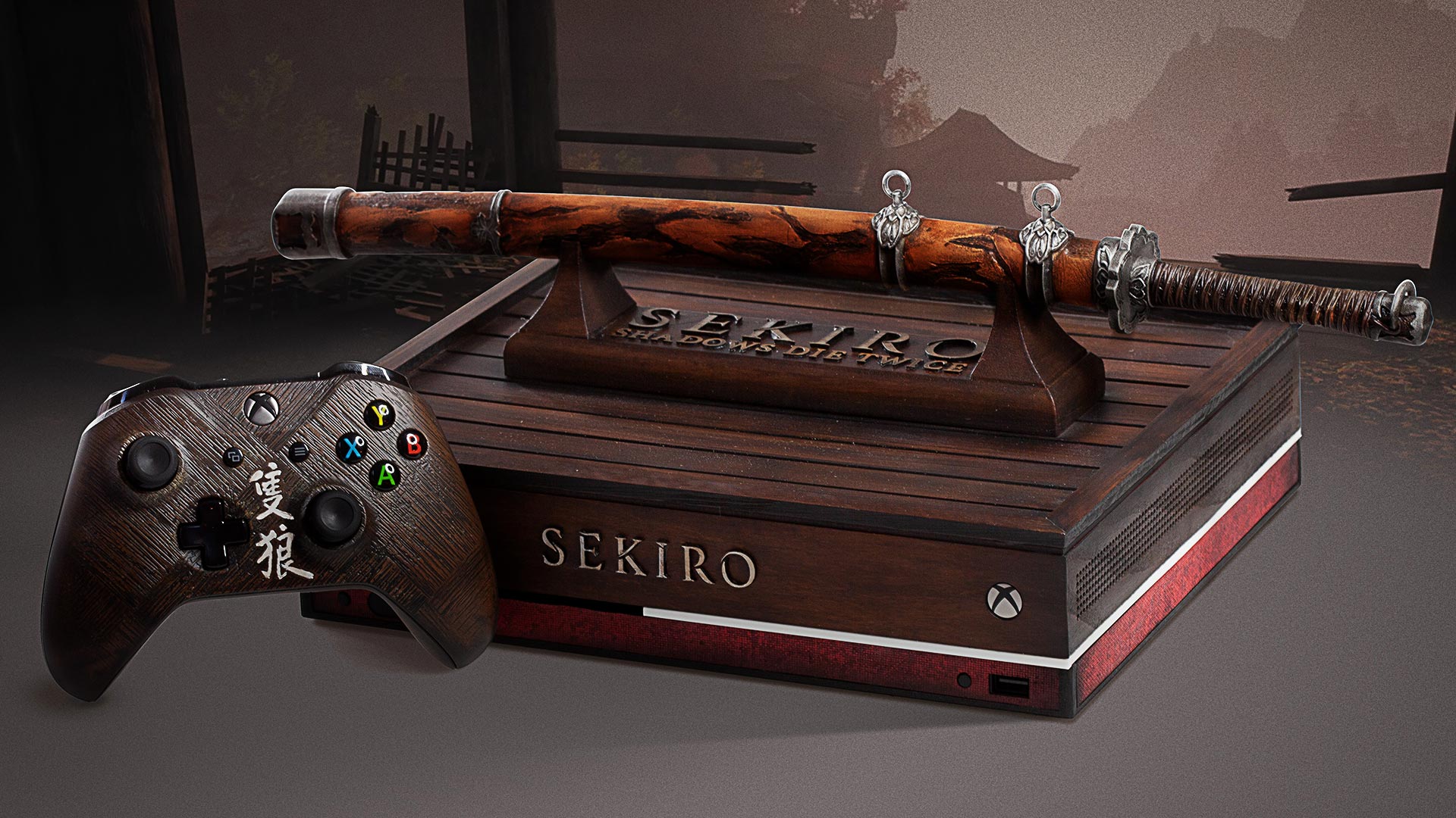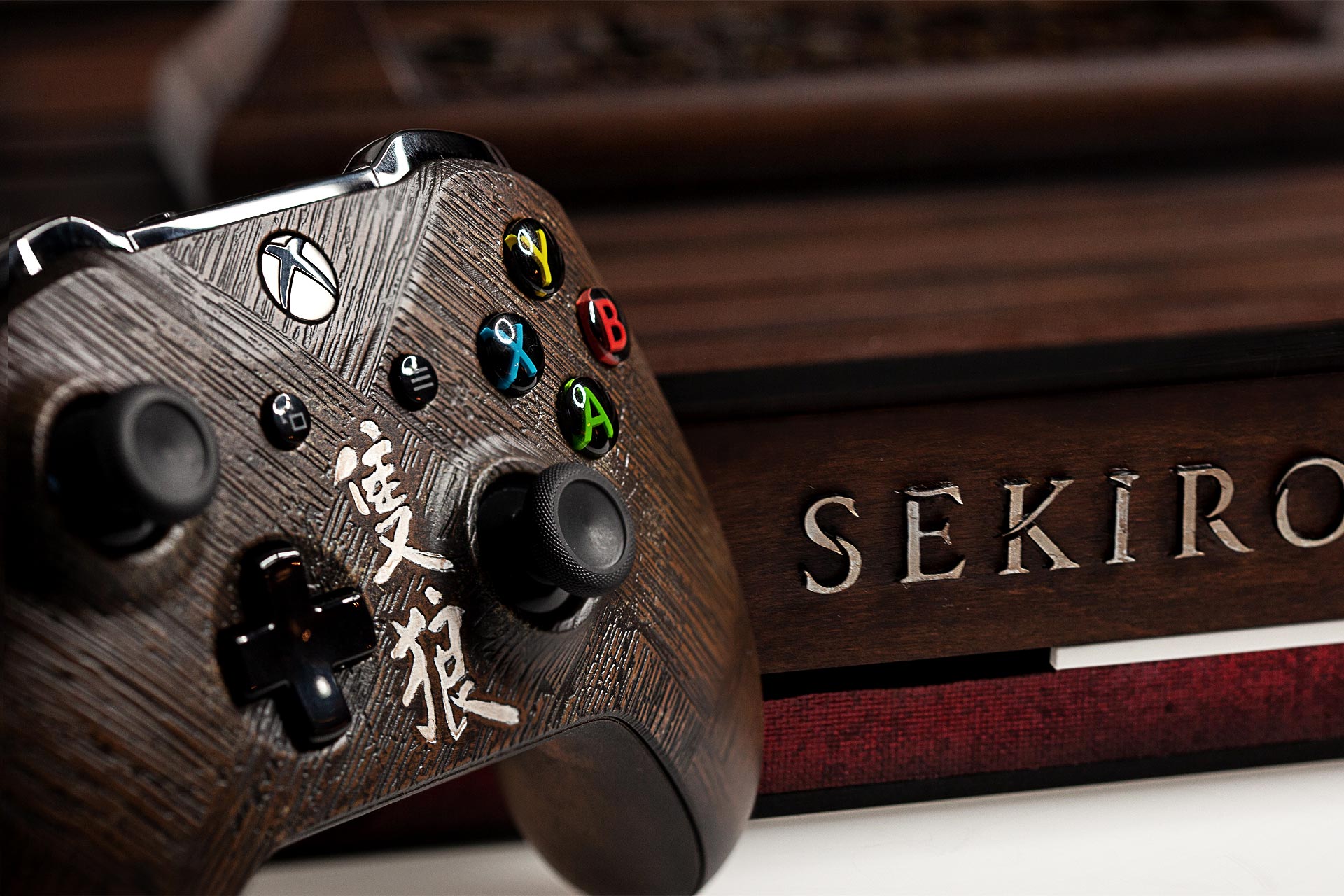 That wood effect flowed through our life-like katana replica down to the bottom of the console; our custom Xbox One was made to look like an ancient wooden box that would have fit perfectly in Sekiro’s fantasy Sengoku period. That wood effect also carried over to the controller, which had a stylish ‘SEKIRO’ written on the front in native Japanese script.