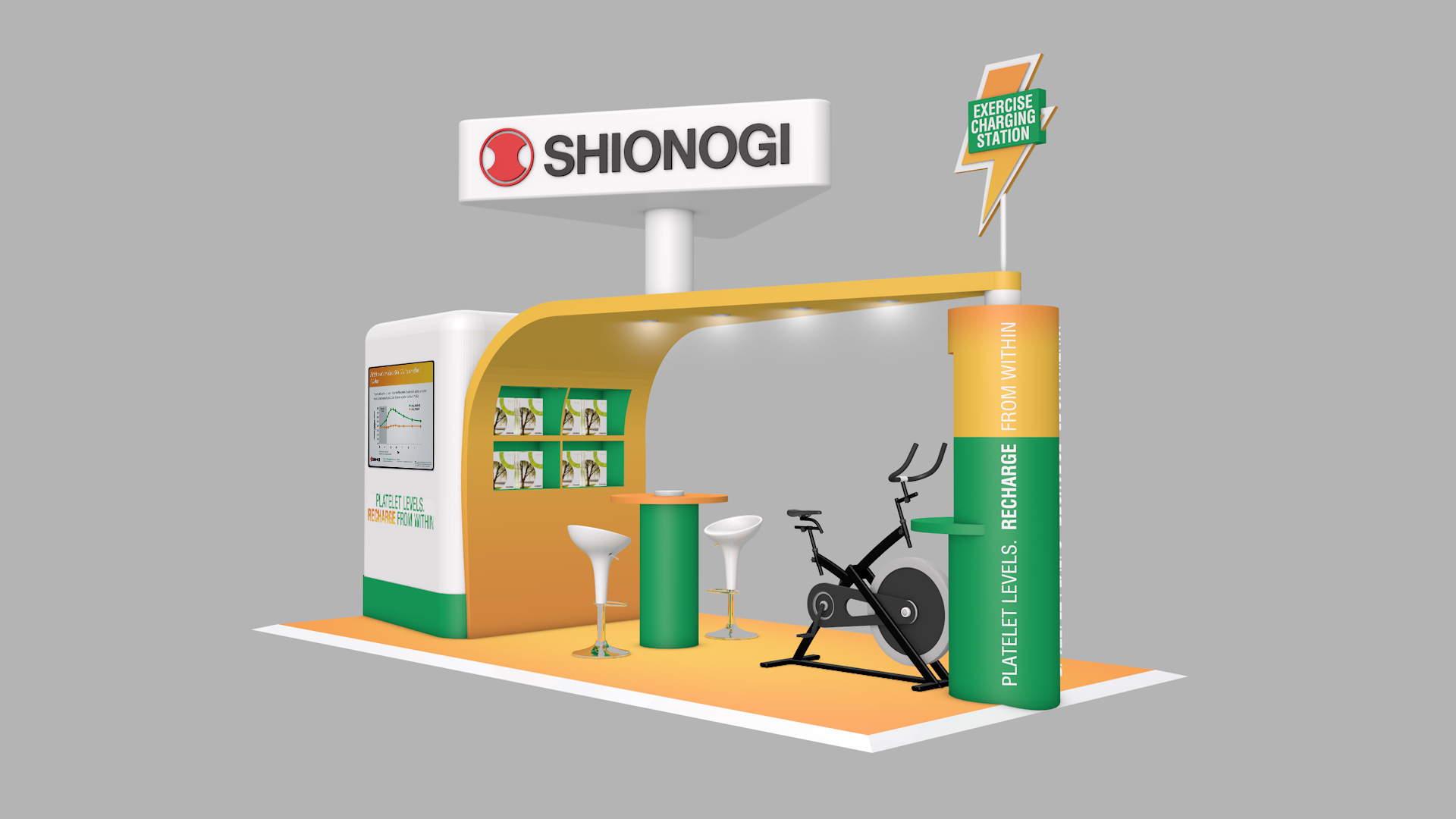 This was the first appearance of our gamified exercise bike. With the bike as a controller, it was built to engage with footfall and potential prospects in a fun way. Visitors needed to pedal to get to a certain stage on screen in a limited time; the activation was a unique way for Shionogi’s team to engage with prospects and make full use of the space available to them.