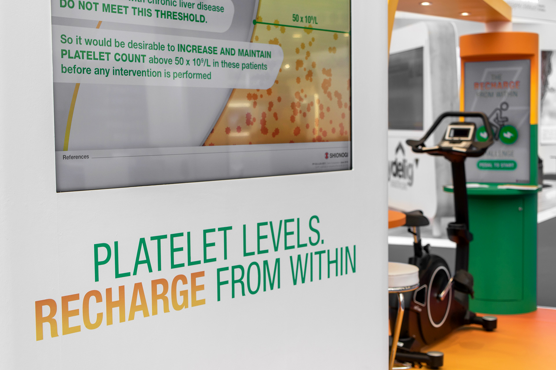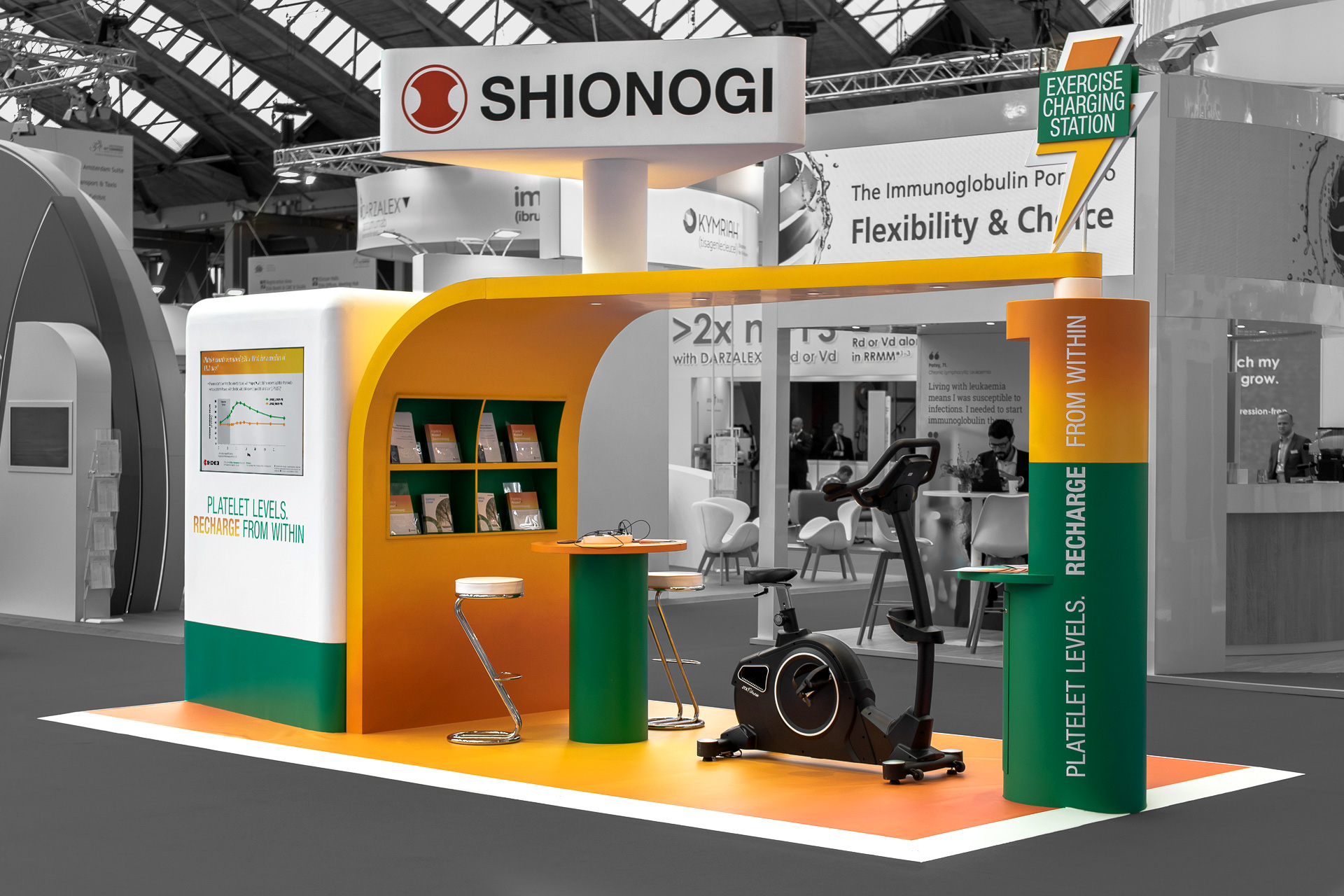 Our interactive exercise bike game complete with ‘Exercise charging station’ made another appearance at CIRSE 19 after its success at EHA 19, and wowed the crowds. The charging station was created with strong greens and oranges to help it stand out; the CIRSE 19 booth was complemented with highly-visual custom ‘SHIONOGI’ light; screens to better inform visitors; content such as brochures and wall charts, and an area for representatives to engage with prospects.