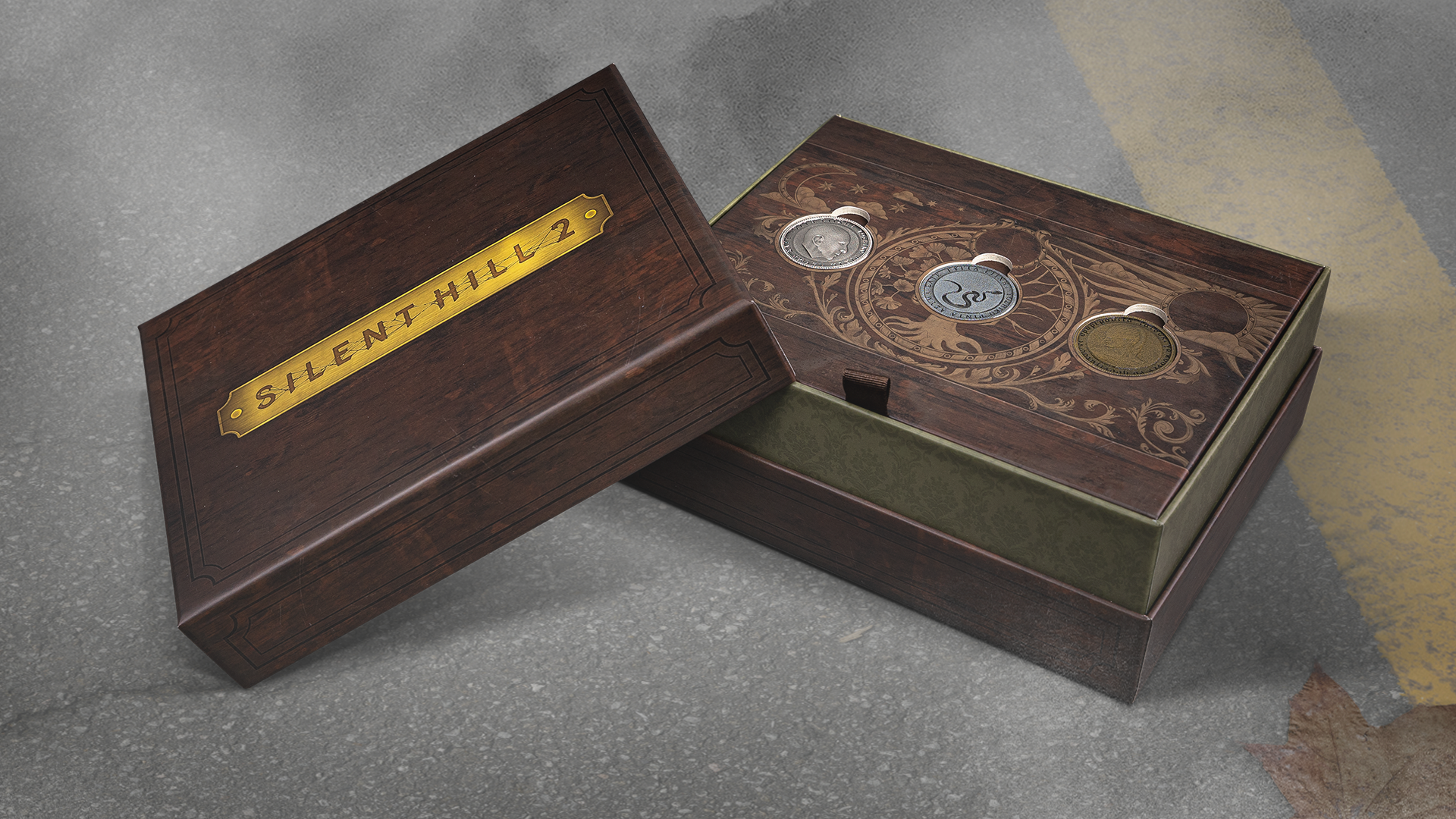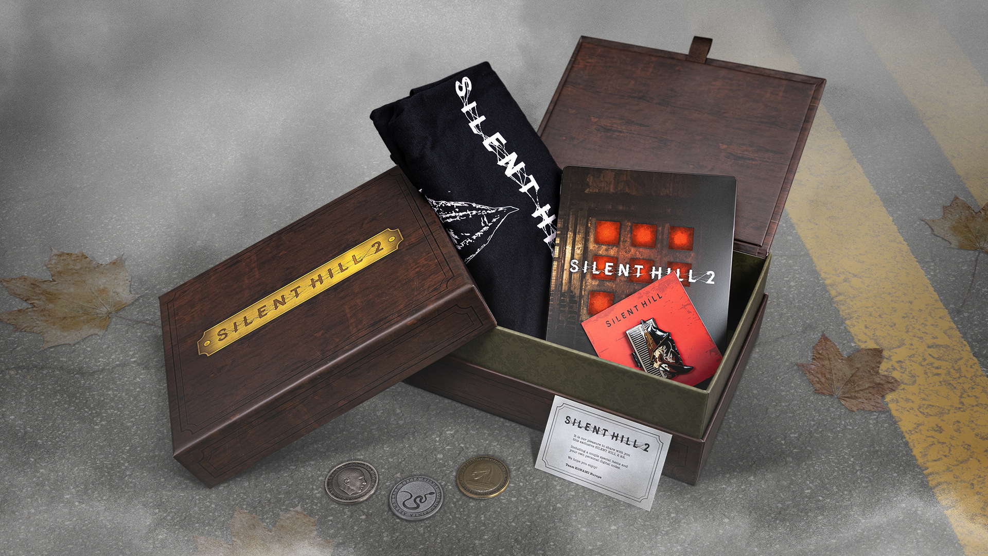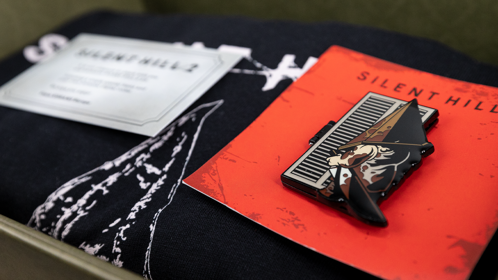 Inside our Silent Hill 2 remake influencer kits were three coins; replicas of the ones needed to solve the in-game puzzle that can slot into the box’s inlay. Solving the puzzle in-game would give the player an apartment key; inside our kits however was a range of cool custom merchandise including a steel case box and a copy of the Silent Hill 2 remake, digital codes to download exclusive content, a Pyramid Head-inspired Silent Hill 2 shirt and pin.