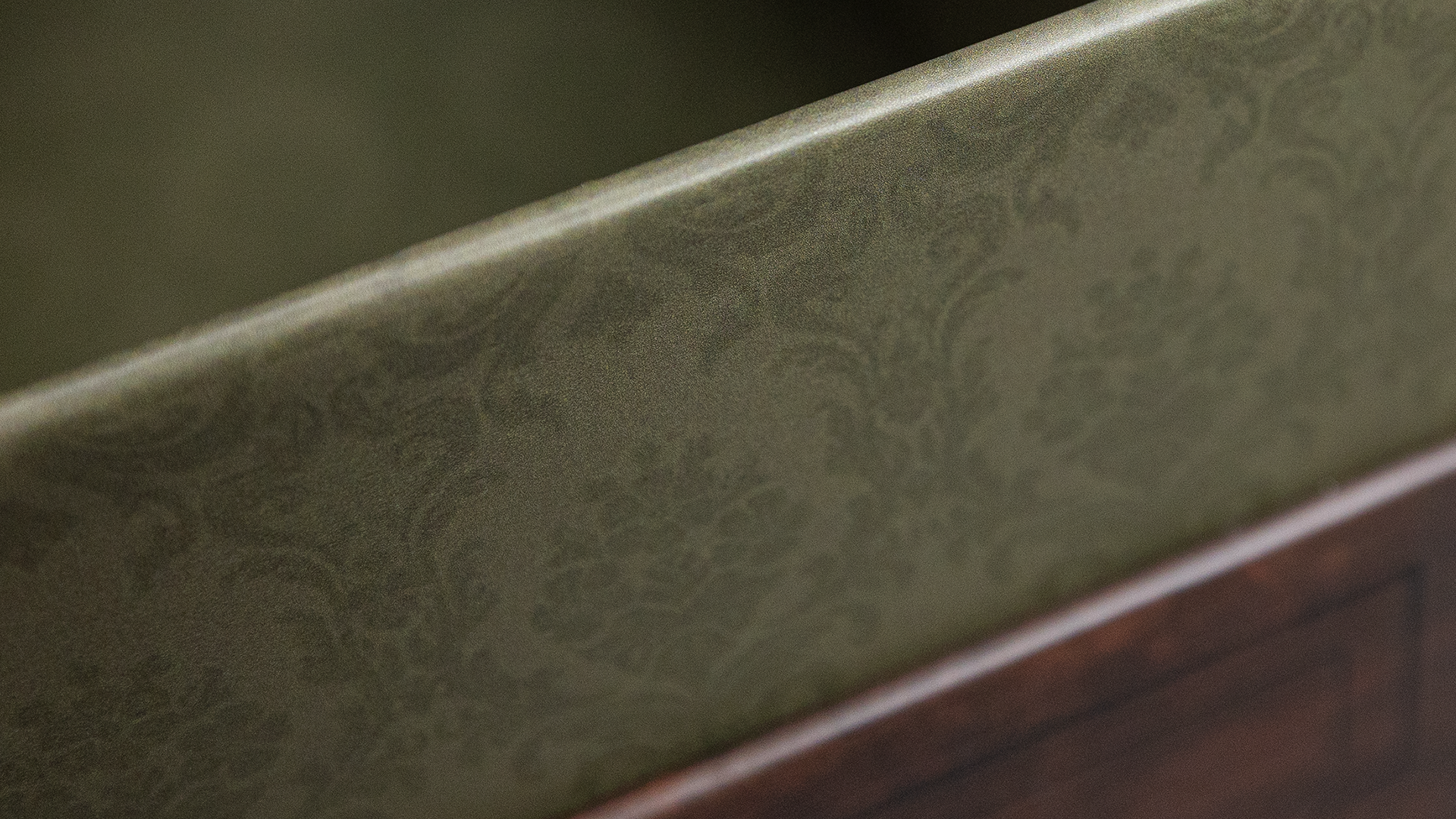 The hotel room is pivotal to the protagonist James Sutherland’s story and is represented by the ornate wood designs and wallpaper pattern of the box.
