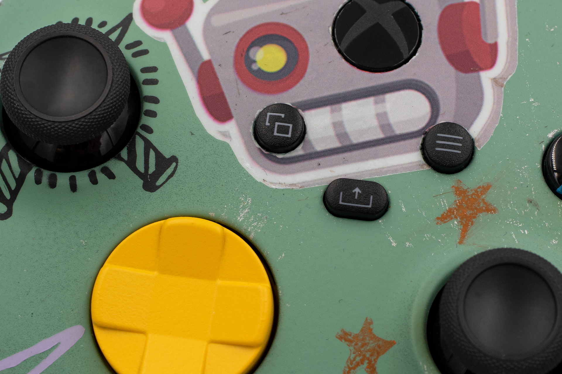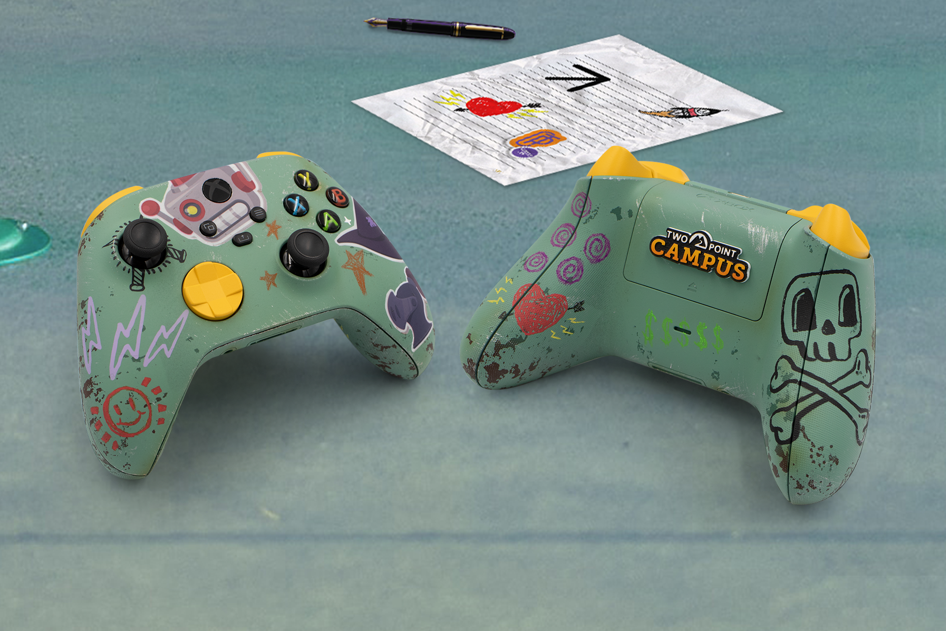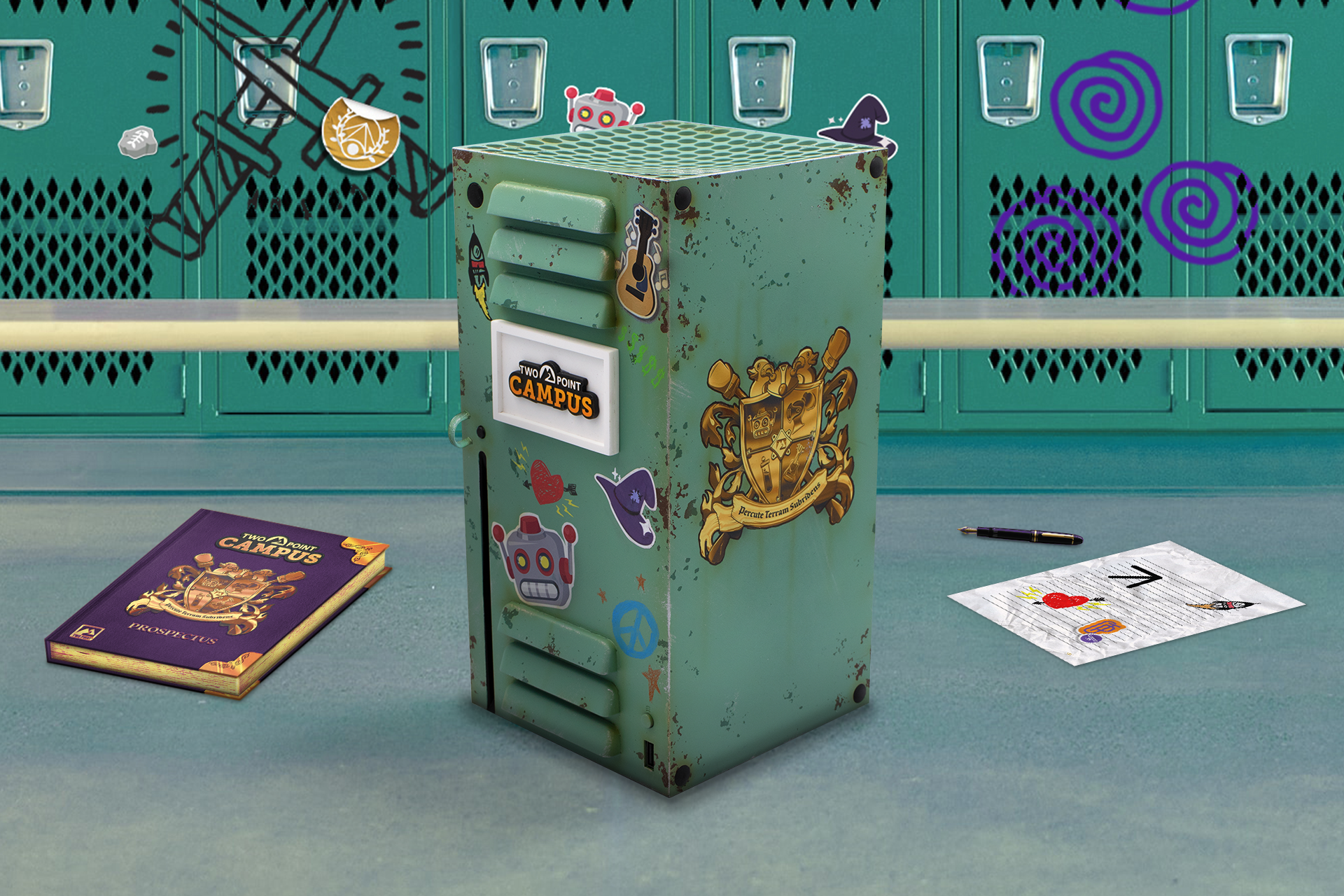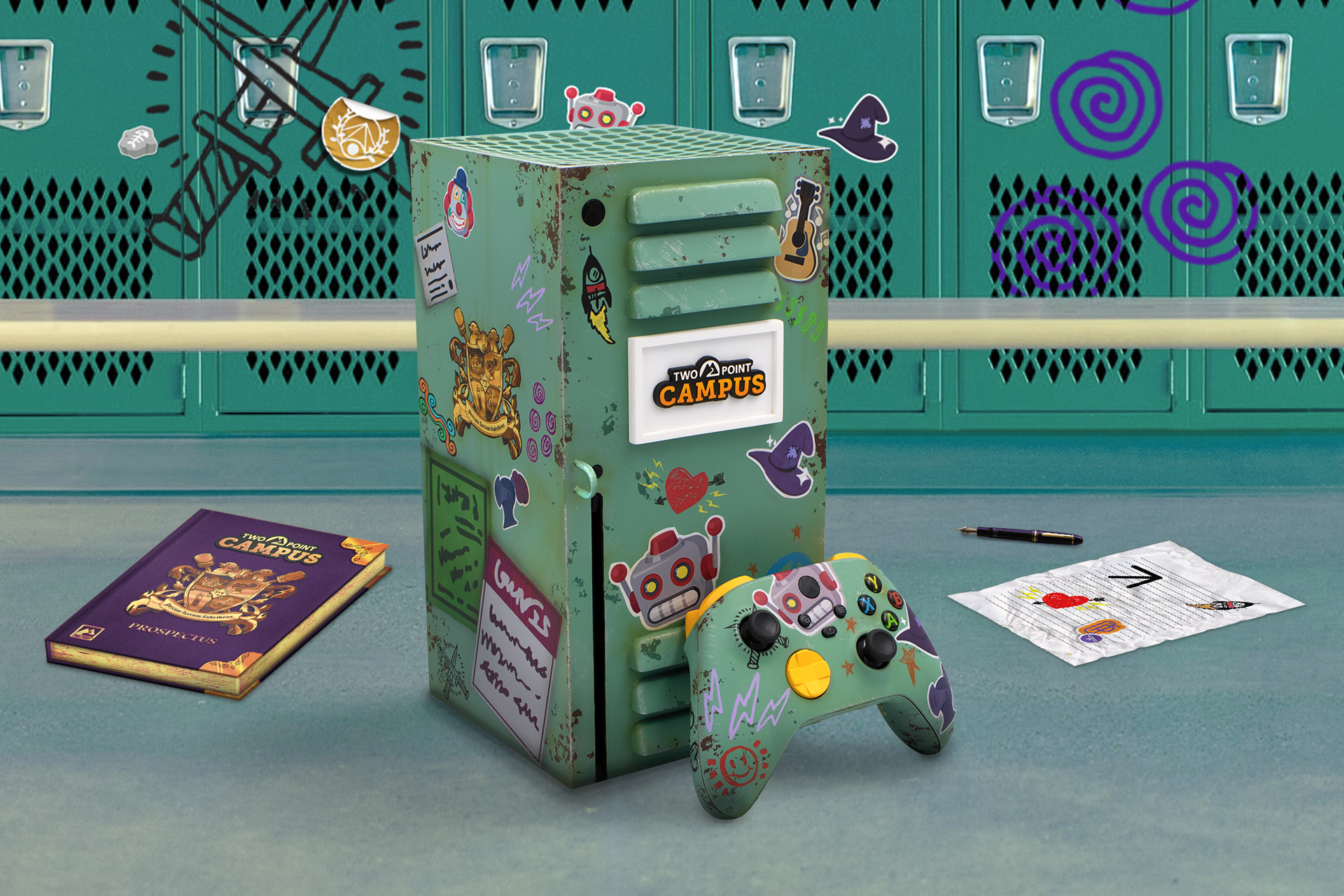 To show off our school spirit, we crafted a custom Xbox Series X console that looked like a much-loved locker. The tower was painted green and given locker vent features, and was covered with fun Two Point Campus-themed class stickers, marker-style graffiti and notes. The console was finished with a 3D ‘Two Point Campus’ crest; the controller included the same colouring and themes.
